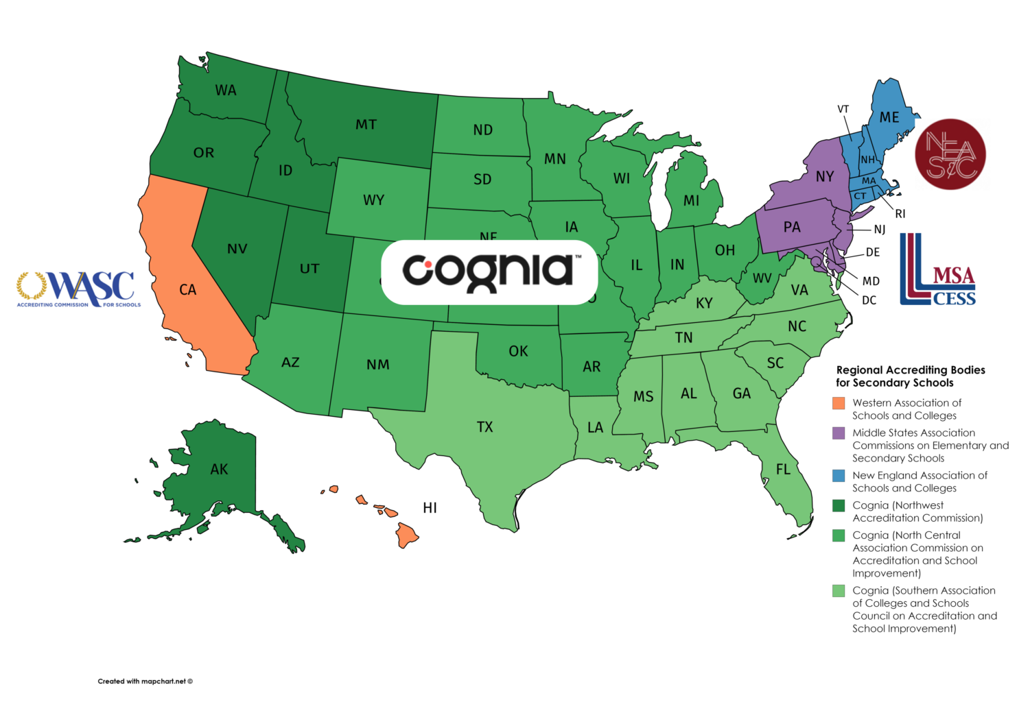 There are currently six different regional accrediting bodies, several of which are subsidiaries of Cognia (formerly AdvancED).  As a starting point for your research, the Kansas Department of Education has put together an unofficial list of recognized associations for accreditation. You can use this as a reference/starting point for your own research. Click here to access that. The map below gives a visual representation of the six regional accrediting bodies in the United States.
